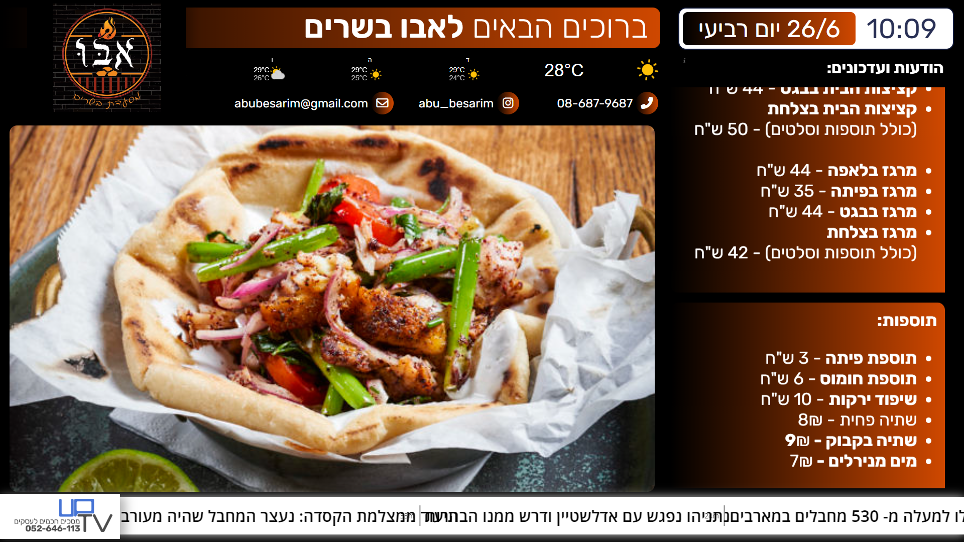 הציגו את תפריטי המסעדה שלכם באופן דינמי ומעודכן בזמן אמת על גבי מסכים חכמים. העלו תמונות אוכל משכנעות, הציגו מבצעים מיוחדים, וספקו מידע שימושי ללקוחותיכם.