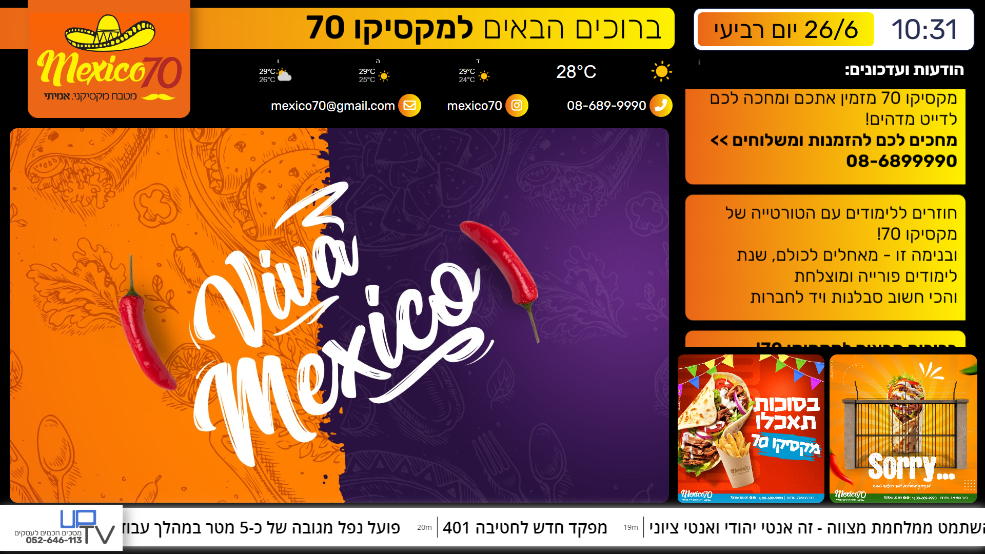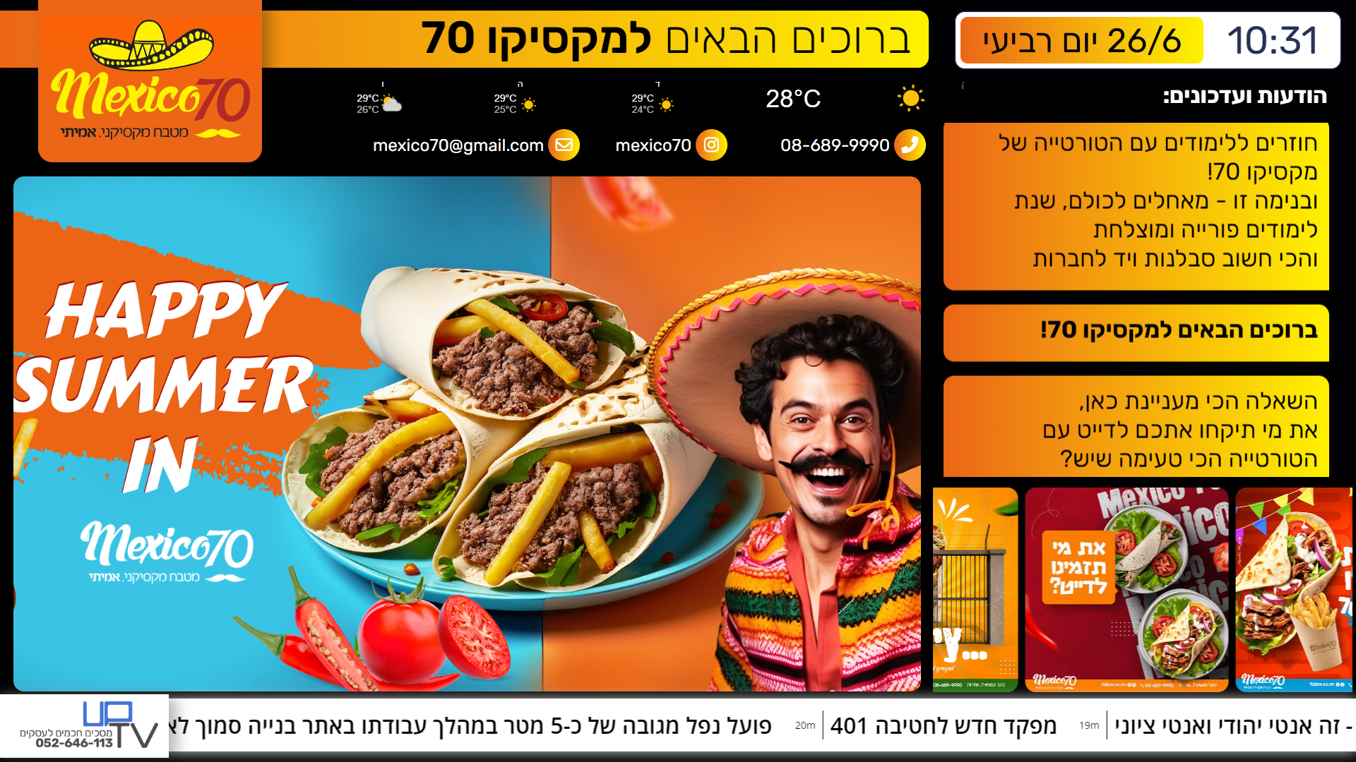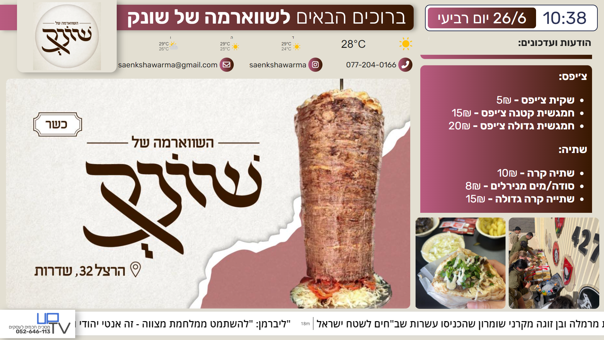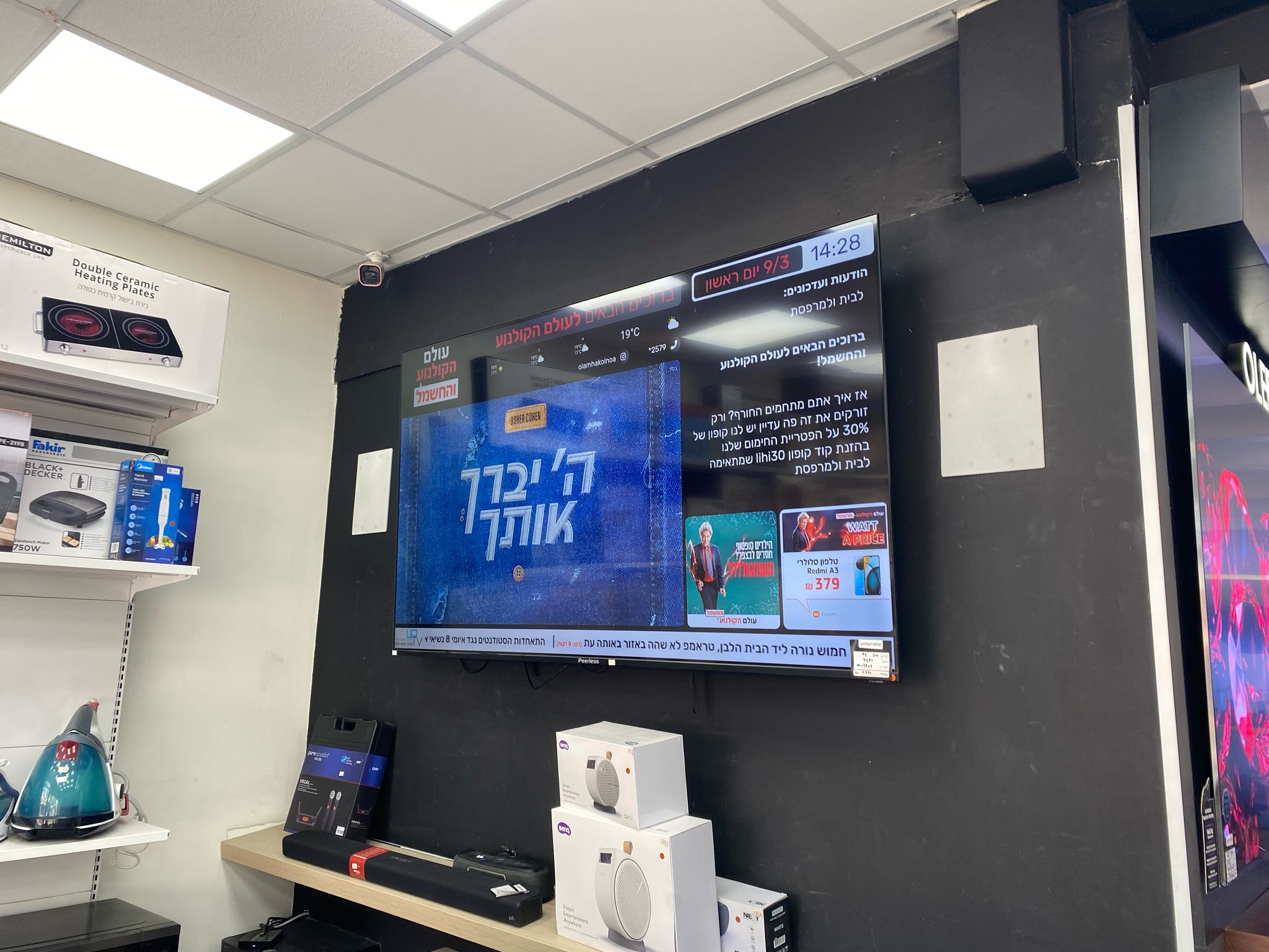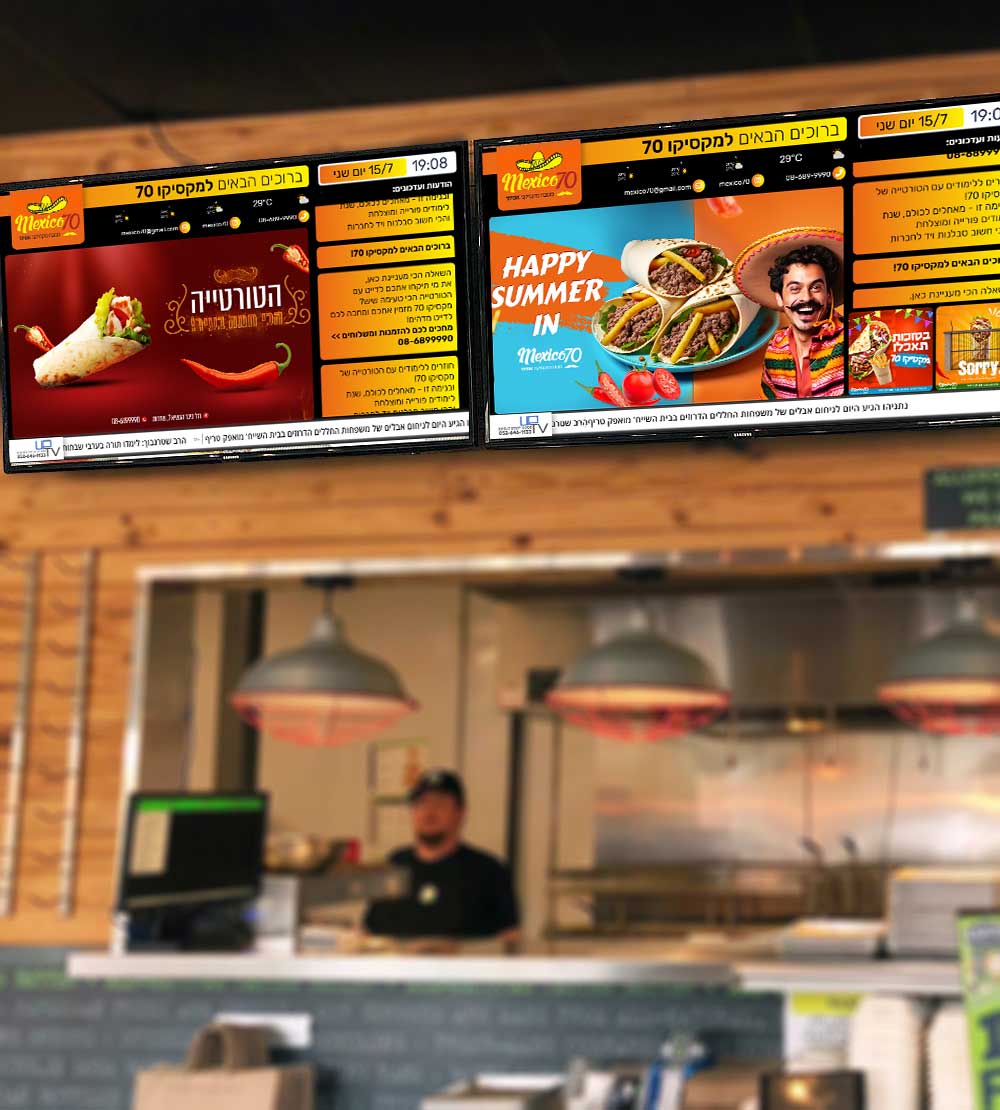 הציגו הודעות שיווקיות, עדכונים חדשותיים, תפריטים עשירים, סרטוני תדמית, וכל תוכן רלוונטי אחר באופן דינמי, חכם ונוח באמצעות הממשק החדשני שלנו.